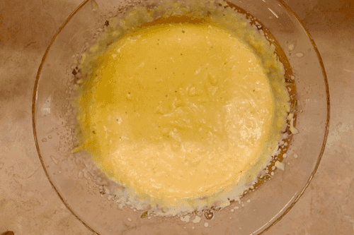 В остывшую мучную заправку добавить 100 мл сливок, желтки, половину натертого сыра, пюре из кочерыжки, соль, перец, мускатный орех. Все тщательно перемешать, взбить.