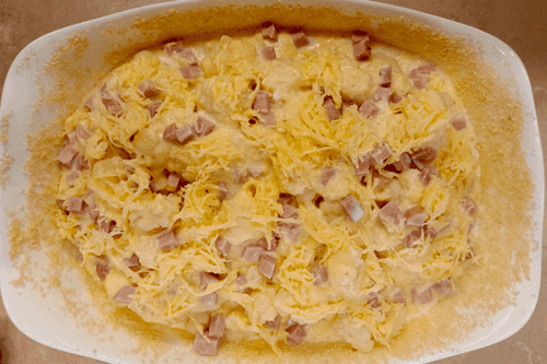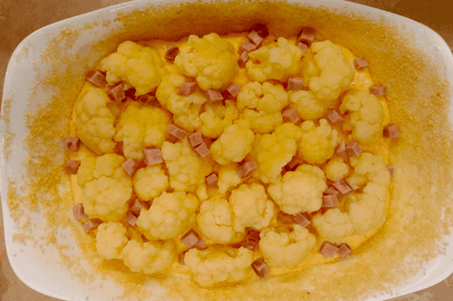 Часть соуса выложить на дно формы, на него цветную капусту, потом кубики ветчины, потом слои повторить.