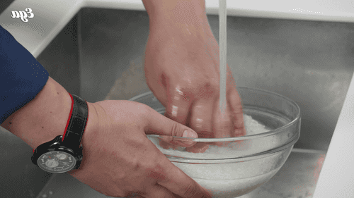 Рис промыть в холодной проточной воде до тех пор, пока вода не станет прозрачной.