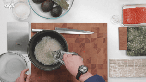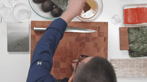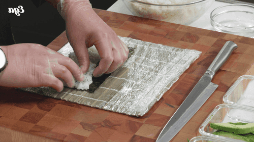 Нори разрезать пополам и выложить половину листа на циновку шершавой стороной вверх, распределить по ней 70 грамм риса, оставив дальний от себя край нори незакрытым.