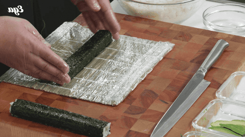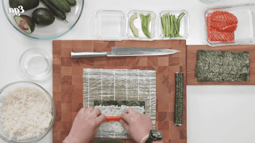 Свернуть ролл от себя, поднимая циновку и придерживая начинку безымянным и средним пальцами. Не нужно сильно сдавливать ролл. Таким же образом поступить со всеми ингредиентами.
