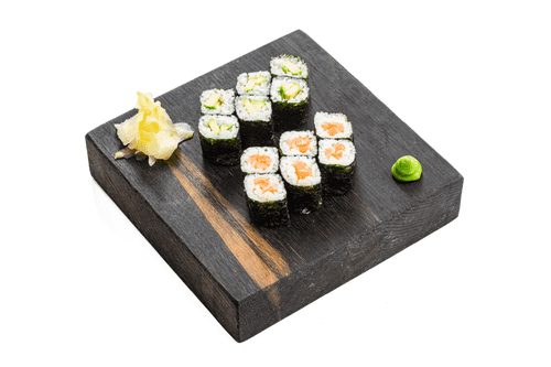 Подавать готовые роллы с васаби, маринованным имбирем и соевым соусом.
