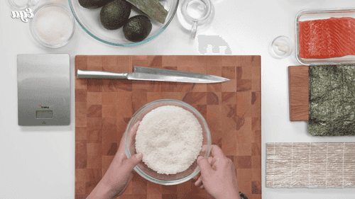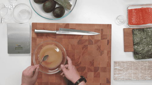 Циновку обернуть пищевой пленкой, сделать в пленке несколько надрезов и выпустить из-под нее воздух. Смазать пленку каплей майонеза, чтобы рис к ней не прилипал.