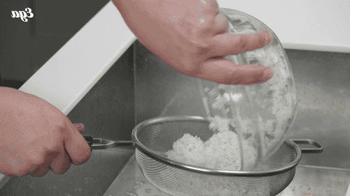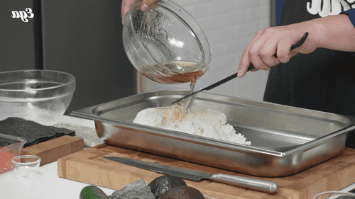 Готовый рис взвесить, чтобы определить количество заправки. На 1 кг готового риса нужно 250 грамм соуса. Добавить соус и хорошо перемешать в большой миске или глубоком противне. Оставить на 10–15 минут.