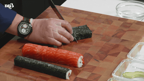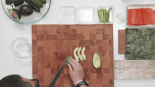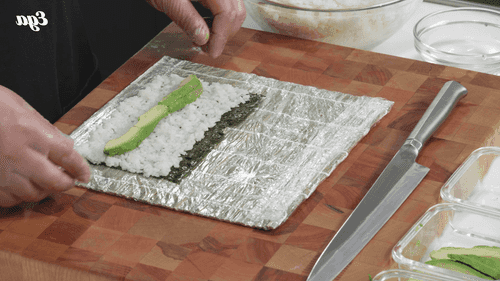 Свернуть ролл от себя, поднимая циновку и придерживая начинку безымянным и средним пальцами. Не нужно сильно сдавливать ролл. Таким же образом поступить со всеми ингредиентами.