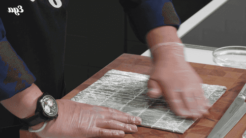 Нори разрезать пополам и выложить половину листа на циновку шершавой стороной вверх, распределить по ней 70 грамм риса, оставив дальний от себя край нори незакрытым.