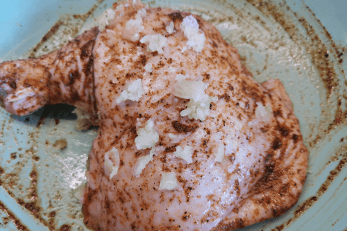 Выдавить чеснок при помощи пресса и тщательно обмазать со всех сторон маринадом.