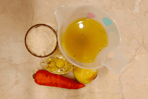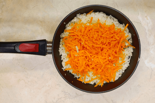 Раскалить сковороду, добавить растительное масло, выложить рис и при постоянном помешивании обжарить до прозрачности.