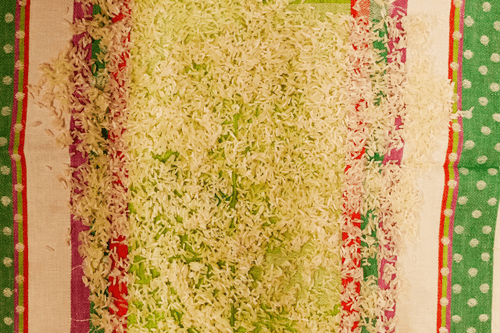 Откинуть рис на сито, дать стечь воде, а затем обсушить его на кухонном полотенце.