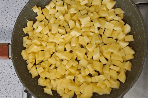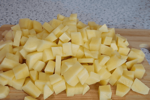 Картофель очистить от кожуры. Хорошо вымыть под проточной водой. Немного обсушить. Нарезать небольшими квадратами.