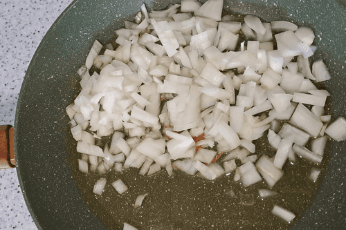 Лук очистить, хорошо вымыть под проточной водой, нарезать небольшими кубиками и выложить в сковороду с маслом.