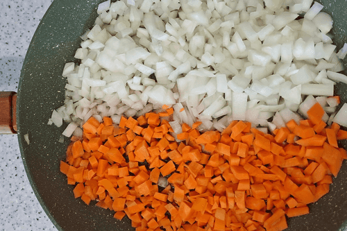 Морковь очистить, хорошо вымыть под проточной водой, немного просушить, нарезать небольшими кубиками, выложить в сковороду к луку и поставить на огонь. Готовить на среднем огне под открытой крышкой, периодически помешивая, до золотистого цвета.