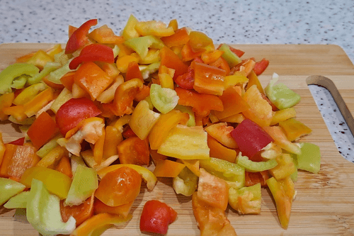 Сладкий перец очистить, хорошо вымыть, нарезать среднего размера кубиками или соломкой.