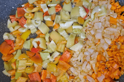 В сковороду к готовым луку и моркови выложить сладкий перец, немного обжарить, периодически помешивая.