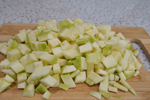 Молодой кабачок хорошо вымыть, просушить, при необходимости очистить от кожуры, нарезать кубиками.