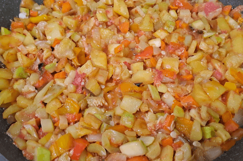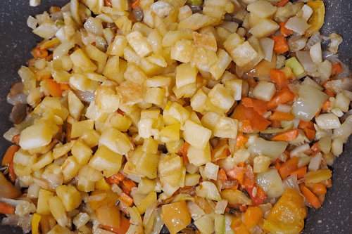 Выложить нарезанный кабачок в сковороду к обжаренным луку, моркови и перцу. Жарить до готовности кабачка, периодически помешивая.