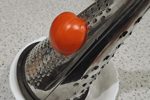 Помидоры хорошо вымыть, просушить, разрезать на две части и натереть на мелкой терке в подходящую емкость.