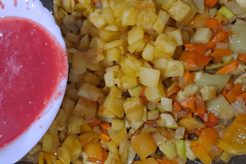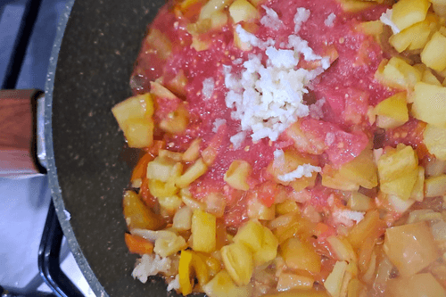 Выложить натертое на терке томатное пюре в сковороду к овощам.