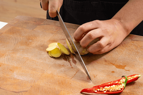 Имбирь нарезать толстыми кружочками, перец чили разрезать пополам.