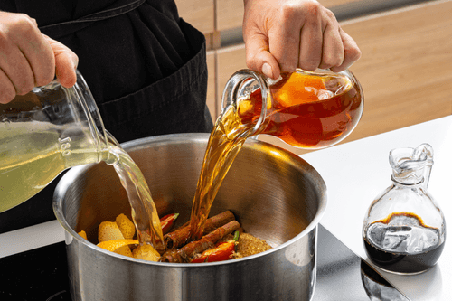 Поставить сотейник с толстым дном на огонь и бросить в него имбирь, чили, бадьян, корицу, сахар и апельсиновую цедру.