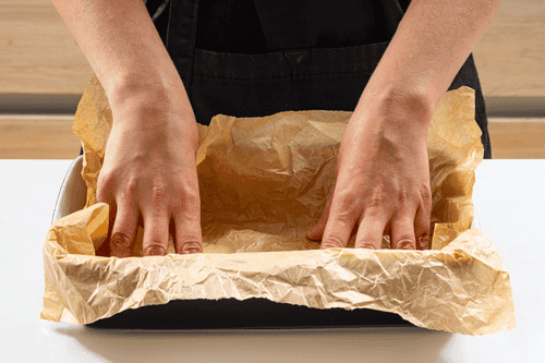 Форму для запекания с высокими бортами выстелить бумагой для выпечки.