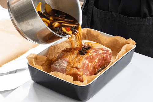 Выложить в форму свинину и полить подготовленным сиропом. Сверху накрыть листом бумаги и фольгой, плотно завернуть края и отправить в духовку на 1,5 часа.