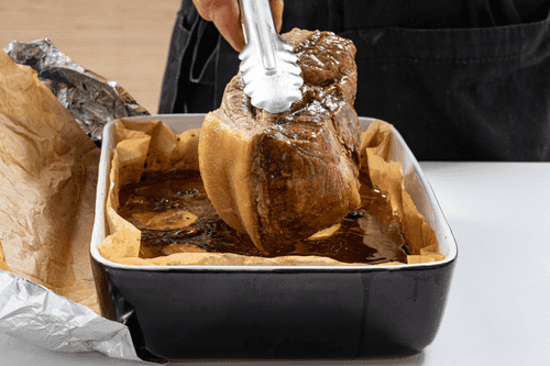 Перевернуть свинину, снова запечатать и отправить в духовку еще на 1,5 часа.