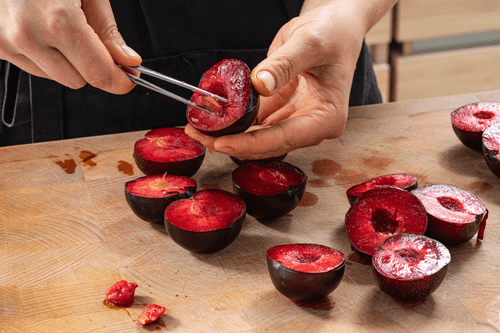 Сливы разрезать пополам и удалить косточки.