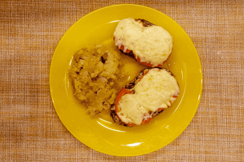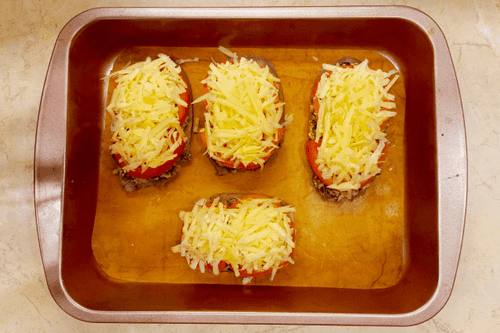 На язык выложить грибную массу, на грибы — помидоры, на помидоры — натертый сыр. Запекать, пока сыр не расплавится, 15–20 минут.
