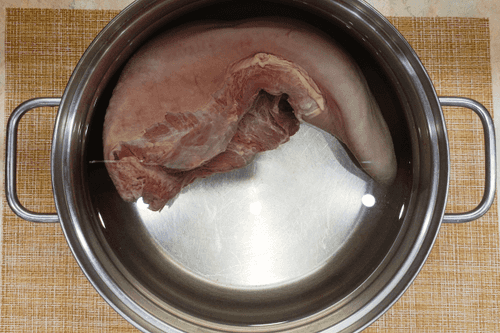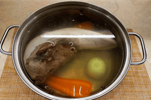 Язык поскоблить ножом, тщательно промыть и замочить в холодной воде минимум на 1 час.