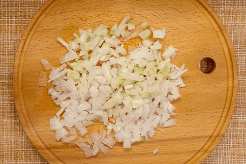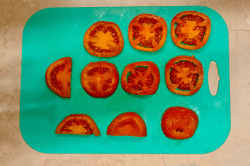 Помидоры разрезать пополам, удалить плодоножку, нарезать пластинами толщиной 0,5 см.