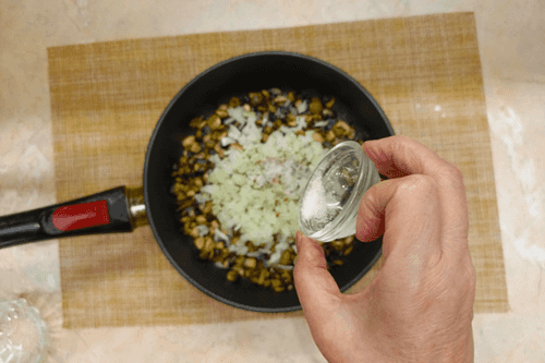 Когда из грибов выпарится жидкость, добавить нарезанный лук, посолить, поперчить, добавить сахар и обжаривать грибы и лук еще 4–5 минут.
