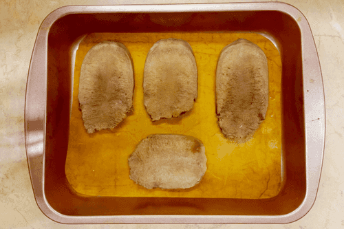 Разогреть духовой шкаф до 180 градусов, форму для запекания застелить пергаментом или смазать маслом, выложить в форму нарезанный язык.