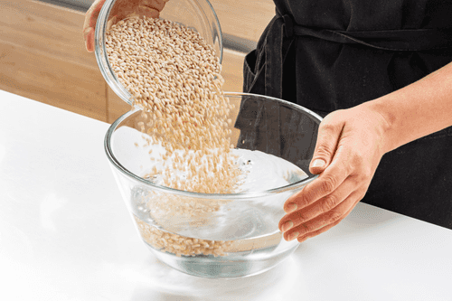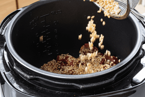 Выложить кашу в сотейник, залить бульоном и готовить на среднем огне до состояние разваренной каши.