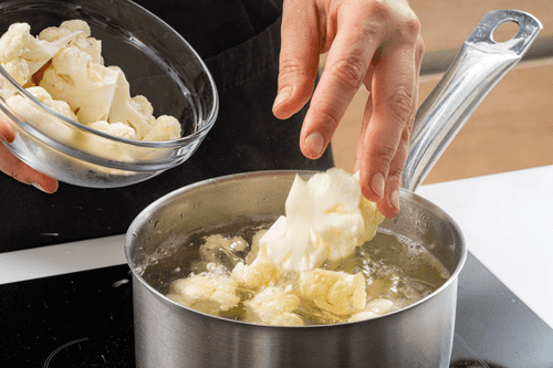 В кастрюле вскипятить воду, бросить в нее картофель, варить 10 минут, добавить цветную капусту и варить до мягкости овощей.