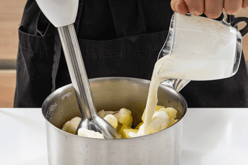 Готовые овощи залить горячими сливками и пробить блендером до гладкости.