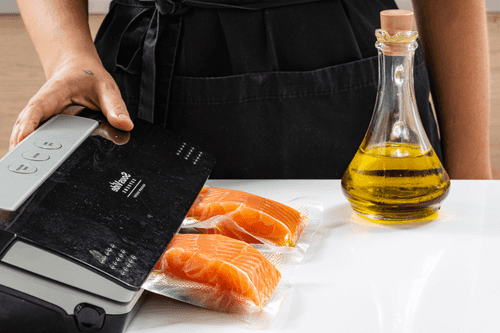 Промыть лосось, просушить бумажными полотенцами. Слегка смазать оливковым маслом, положить в пакет и завакуумировать. Варить в су-виде при 52 градусах 15 минут.