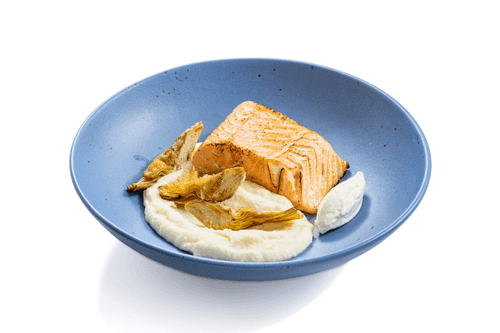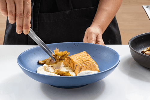 Выложить на тарелку лосося, пюре из цветной капусты, артишоки и лимонный крем.