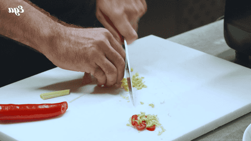 Нарезать чили тонкими ломтиками, избавив его от семян.
