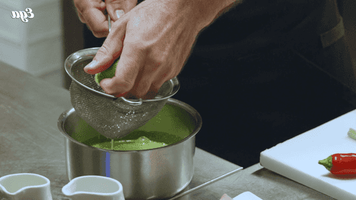 Получившуюся массу перелить в сотейник, добавить сок лайма, оставшиеся сливки и кокосовое молоко.