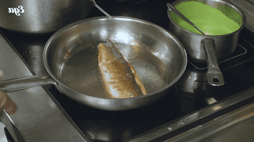 В сковороде разогреть растительное масло и выложить на нее филе рыбы кожей вниз, хорошо придавить лопаткой, чтобы не дать коже съежиться.