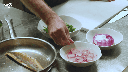 Филе сибаса посолить и поперчить, а затем обвалять в муке только со стороны кожи.