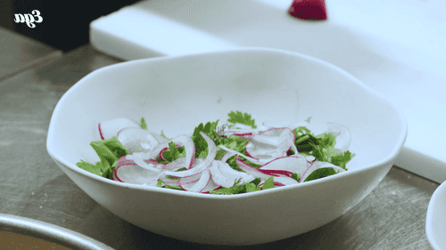 Очень тонкими перьями нарезать красный лук. Смешать руколу, укроп и оставшиеся кинзу и петрушку, добавить к ним редис и лук. Заправить салат оливковым маслом и солью.