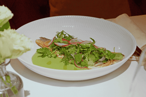 На дно тарелки налить соус, выложить на него рыбу, а сверху зеленый салат.