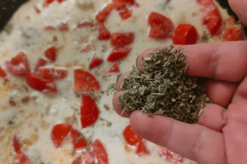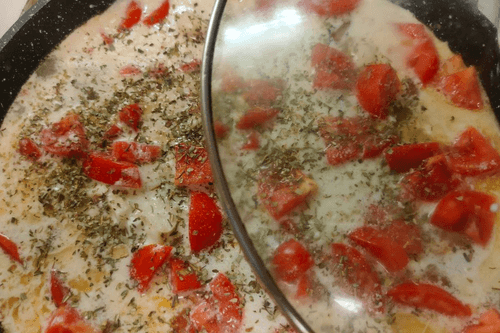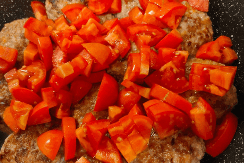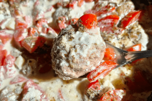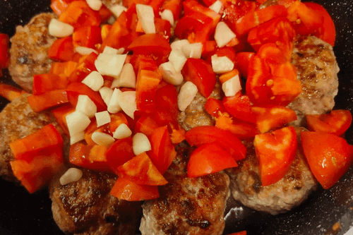 Тефтели из говяжье-куриного фарша тушеные с помидорами и чесноком в сметанном соусе