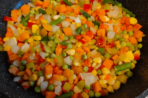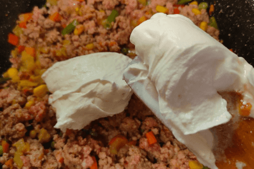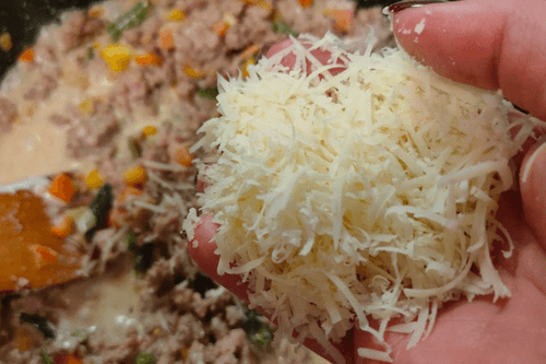 Натереть сыр и половину добавить к смеси овощей и фарша, перемешать, довести до кипения и снять с огня.