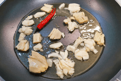 Обжаривать на сковороде имбирь, чеснок и чили 3–4 минуты, периодически помешивая.