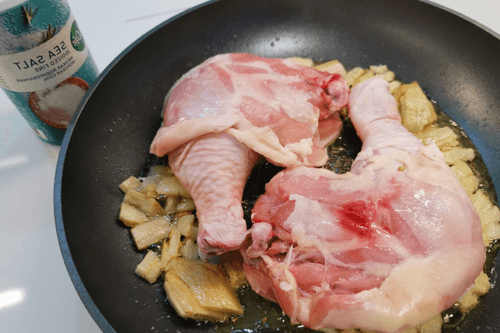 Выложить окорочки и посолить. Обжаривать 3–5 минут на сильном огне до золотистого цвета.