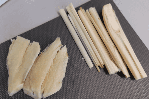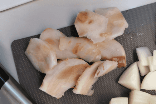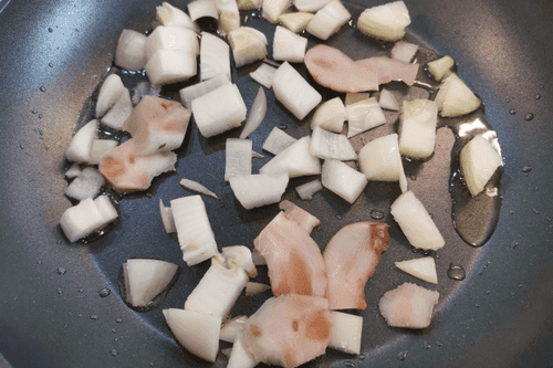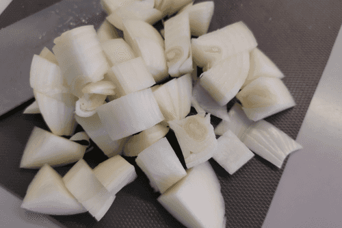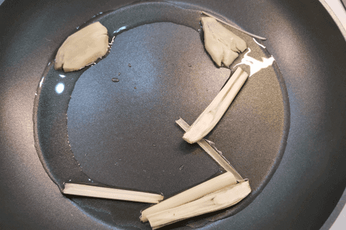 Удалить имбирь и лемонграсс. Выложить на сковороду корень галангала и лук.