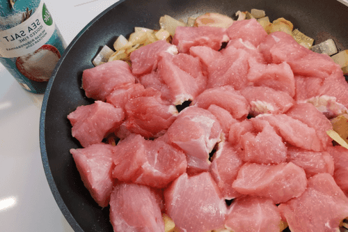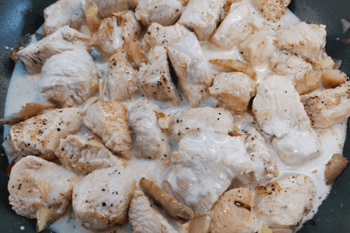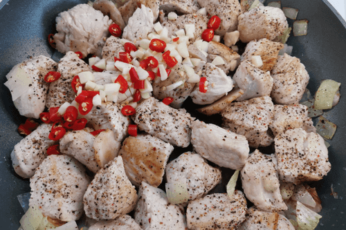 Через 2 минуты перемешать и выложить на сковороду индейку.